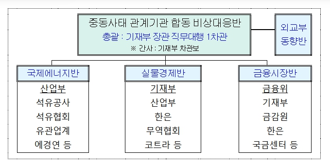 정부는 관계기관 합동 비상대응반을 가동해 중동 상황과 금융·실물동향을 24시간 모니터링하면서, 특히 시장이 우리 경제 펀더멘털과 괴리되어 과도한 변동성을 보일 경우 상황별 대응계획(Contingency plan)에 따라 관계기관 간 긴밀한 공조 하에 즉각적이고 과감하게 조치해 나갈 계획이다. 아울러, 에너지·수출 등 실물경제 영향을 면밀히 점검하고, 이상징후 발생 시 관계부처가 적극 협업해 신속하게 대응해 나가기로 했다.