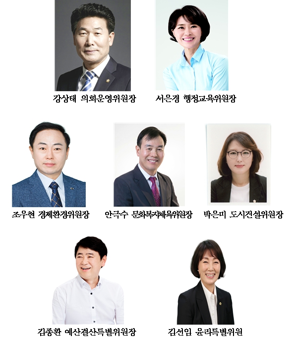 이번 선거에서는 의회운영위원장에 강상태 의원, 행정교육위원장에 서은경 의원, 경제환경위원장에 조우현 의원, 문화복지체육위원장에 안극수 의원, 도시건설위원장에 박은미 의원이 선출됐다.