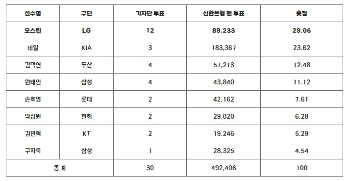 오스틴은 기자단 투표 30표 중 12표(40.0%), 팬 투표에서 492,406표 중 89,233표(18.1%)를 받아 총점 29.06점을 획득, 기자단 3표, 팬 투표 183,367표, 총점 23.62점으로 2위를 차지한 KIA 네일을 제치고 최종 1위에 올랐다.