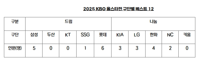 한편, 2025 신한 SOL뱅크 KBO 올스타전에 출전할 양 팀 감독(드림 올스타 박진만 감독, 나눔 올스타 이범호 감독)은 각 팀 13명씩, 총 26명의 추천선수를 선정해 추후 발표할 예정이다.
