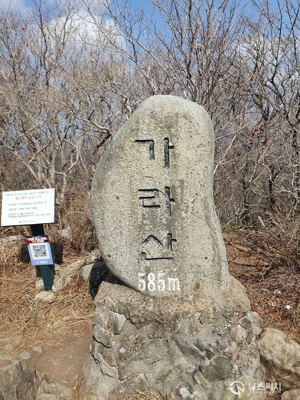 오르막이 지속되어 약간은 힘이 들었지만 힘을 내서 계속 걸어 오전 11시 30분에 거제도에서 가장 높은 산인 해발 585m 높이의 ‘가라산(加羅山)’ 정상에 도착하였다. 가라산 정상을 기점으로 동부면 학동리, 남부면 탑포리와 다대리가 나뉜다.