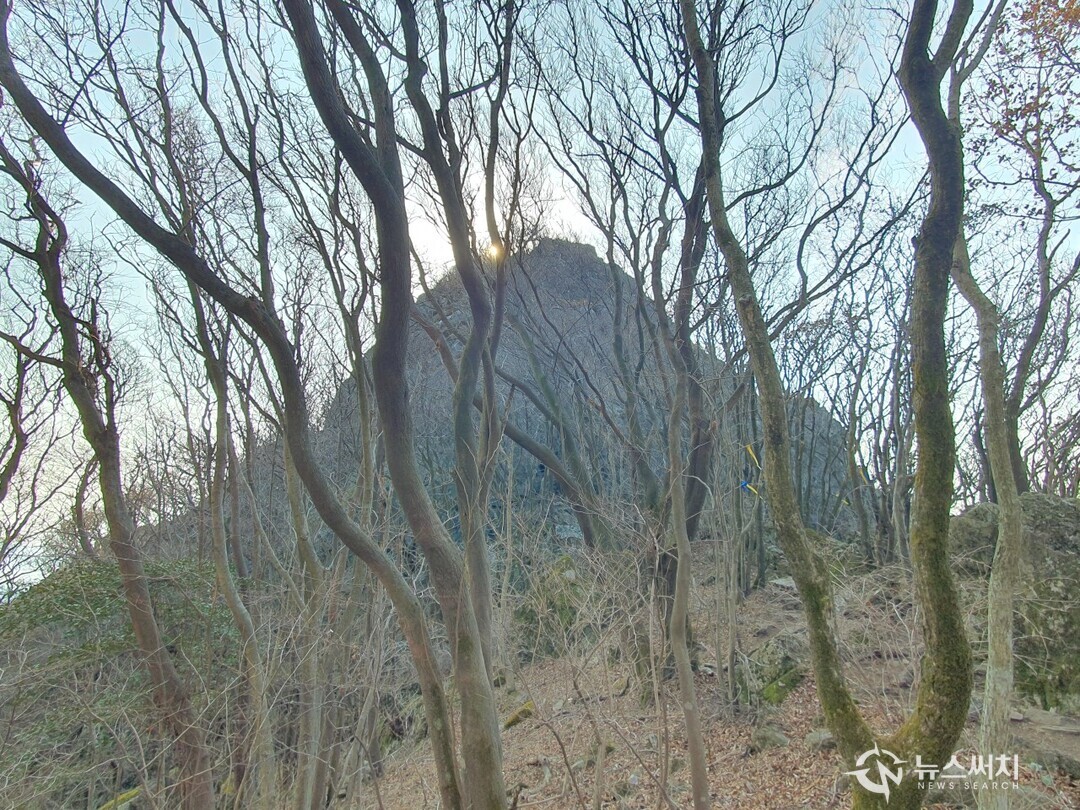 남쪽에서 바라본 가라산 정상. 가라산 남쪽에는 급경사의 절벽 등이 자리잡고 있다. 가라산에서 남쪽방향으로 내려온 뒤 가라산 정상을 바라보면 생각보다 우뚝 솟은 높은 봉우리가 조망된다.