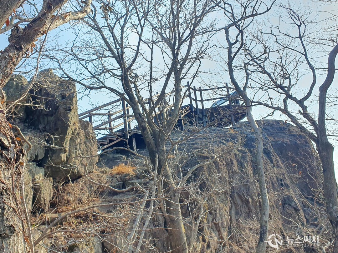 뫼바위 전망대. 노자산 마늘바위에서 남쪽방향으로 가라산을 향해 가다보면 뫼바위가 나오며 뫼바위 정상에 전망대가 설치되어 있다. ‘뫼바위’는 ‘매바위’, ‘선녀봉’이라고도 불리우며, 매가 산중에 올라앉아 내려다보는 모양과 닮았다고 한다.