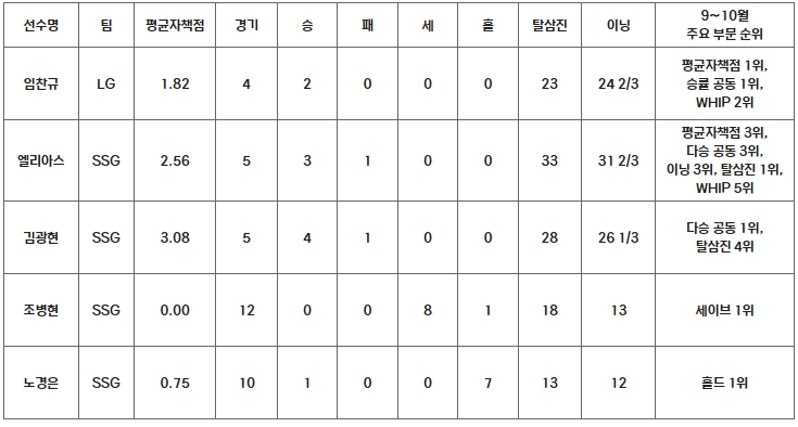 SSG 엘리아스는 치열한 순위 싸움 속 팀의 1선발다운 모습을 보여줬다. 9월 등판한 5경기에서 3승 1패를 기록하며 다승 공동 3위에 올랐고, 31 2/3이닝을 투구하며 이닝 부문은 3위에 올랐다. 4경기에서 퀄리티스타트 이상을 투구하는 등 평균자책점 2.56(3위)을 기록했고 33탈삼진(1위)으로 경기당 평균 6개가 넘는 탈삼진을 솎아내며 위력적인 피칭을 선보였다.