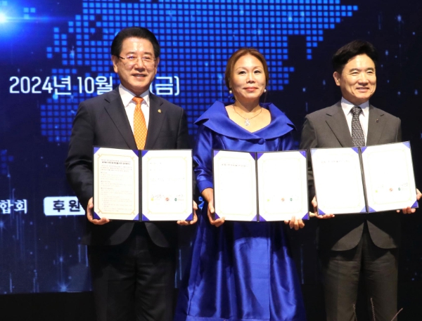 | ▲ 김영록 전라남도지사가 4일 오후 신안 라마다 호텔에서 개최된 “2024 세계호남인의 날 기념대회”에 참석해 김대중 전라남도 교육감(전남미래교육재단 이사장), 이기자 세계호남향우회총연합회장과 호남 미래인재 육성을 위한 업무협약을 체결하고 있다. |