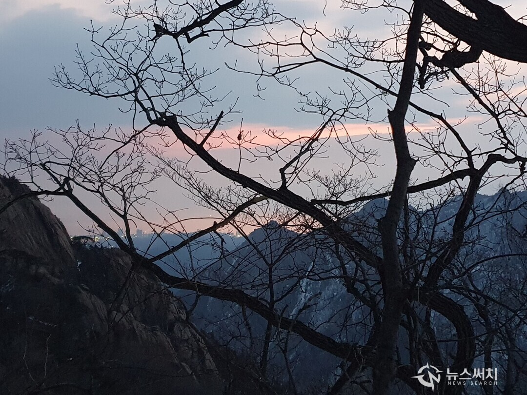 여명이 비치는 설악산. 설악산 비선대삼거리에서 마등령 삼거리까지 약 3.5km 구간은 설악산 최고난이도의 오르막 등산코스로 유명하다. 지난 3월 1일 새벽 5시경 비선대를 통과할 때에는 상당히 어두웠지만 마등령삼거리를 향해 약 1시간 30분 정도 오르막 산행을 하여 세존봉 부근을 통과할 때에는 아침이 다가오는 새벽에 밝아오는 여명이 온 설악산에 비쳐 설악산의 어두움을 내쫓고 있었다.
