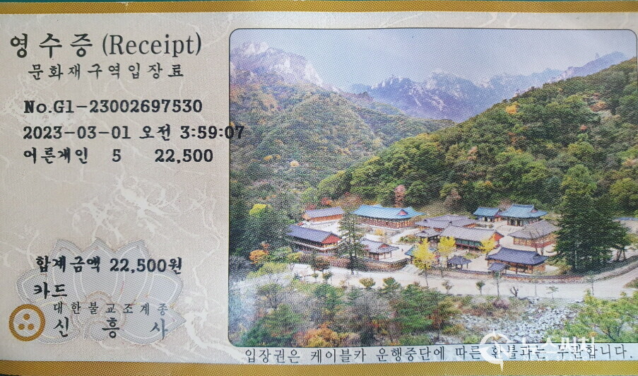 설악산 설악동 문화재구역입장료 영수증. 2007년 국립공원 입장료가 폐지되었지만 국립공원 내 사찰 중 사찰을 방문하지 않고 등산로만 이용하는 경우에도 ‘문화재구역입장료’라는 명목으로 사찰에 통행료를 내게 되어 논란이 많았다. 설악산의 주봉인 대청봉, 울산바위, 비선대, 마등령, 공룡능선 등 외설악의 주요 명소 중 상당수가 ‘신흥사’ 소유의 땅에 속해 있기 때문에 외설악을 산행하려면 신흥사를 방문하지 않아도 신흥사에 ‘문화재구역입장료’를 지불하였다. 다만, 신흥사 문화재구역입장료는 문화재보호법 개정으로 인해 2023년 5월 4일자로 면제되었다. 이제 설악동 문화재구역입장료 영수증은 과거 유물이 되어 버렸다.