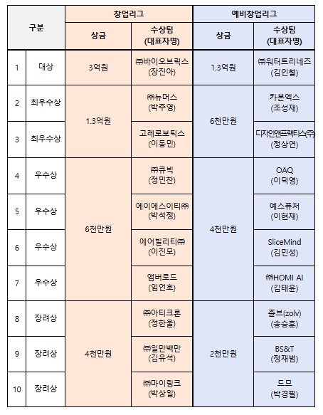 수상기업들에게는 상금과 상장 이외에도 ‘25년 예비·초기·도약패키지 등 창업사업화 지원사업에서의 평가우대 등 후속 연계지원 혜택도 주어진다.