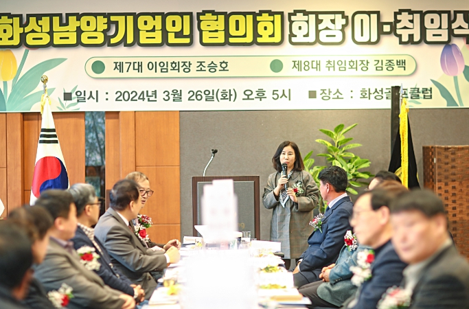 [뉴스서치] 화성시의회 김경희 의장은 3월 26일, 화성 골프클럽 연회장(화성시 남양읍)에서 열린 남양기업인 협의회장 이·취임식에 참석해 지역 경제 활성화를 응원했다.