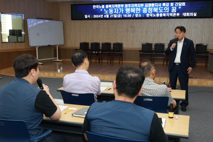 [뉴스서치] 김영환 충북지사는 21일 충북 노동자종합복지관(미평동)에서 한국노총 청주지부 임원 및 조합원 50여명을 대상으로'노동자가 행복한 충청북도의 꿈'이라는 주제로 특별 강연을 진행했다.