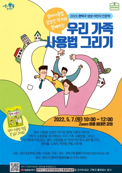 ‘우리 가족 사용법 그리기’ 강좌는 관내 초등학생 20명을 대상으로 오는 5월 7일 오전 10시부터 12시까지 진행한다.