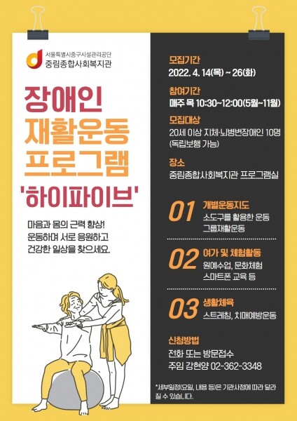 '하이파이브'는 장기간의 코로나 상황으로 활동량이 줄어 신체기능이 저하된 장애인들의 건강한 일상회복을 돕기 위해 중구 보건소가 중림종합사회복지관과 함께 기획한 재활 통합 프로그램이다.