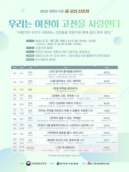 도서관 관계자는 “혼자 읽기 어려웠던 고전을 전문가와 함께 읽어보며 고전 읽기의 즐거움을 알아가는 시간이 되기를 기대한다”고 밝혔다.