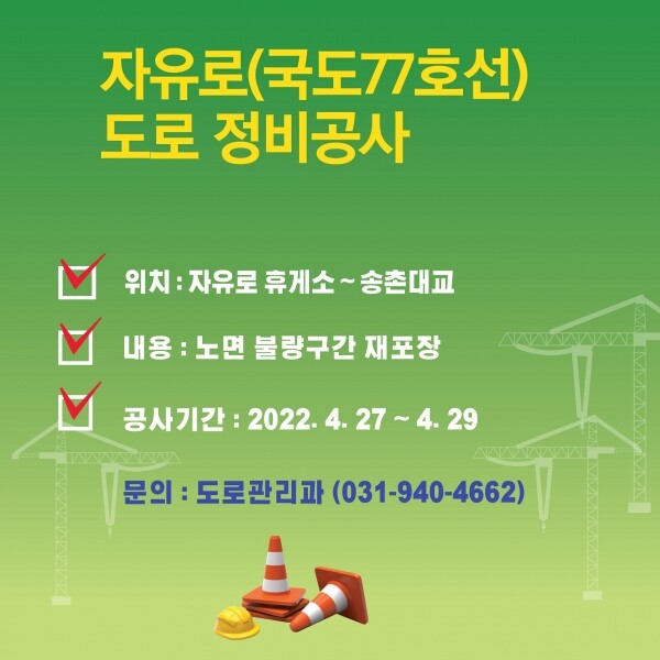통일로 도로재포장 구간은 5월 6일부터 7일까지 아동동 PX마을 및 농업기술센터 구간을, 자유로는 4월 27일부터 29일까지 자유로휴게소부터 송촌대교 남단까지 전체 구간 중 약 7개 구간을 공사할 예정이다.