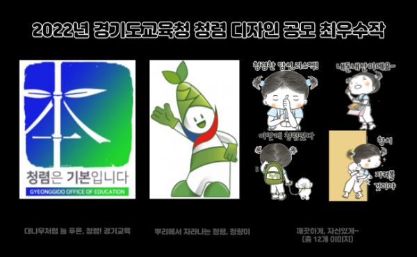 청렴 인물 그림 분야에서는 중·고등부 응모작 ‘뿌리에서 자라나는 청렴, 청량이’가 최우수의 영예를 차지했는데 땅속에서 단단하고 빠르게 자라는 죽순처럼 기초부터 탄탄하게 청렴을 키우는 경기교육을 표현했다.