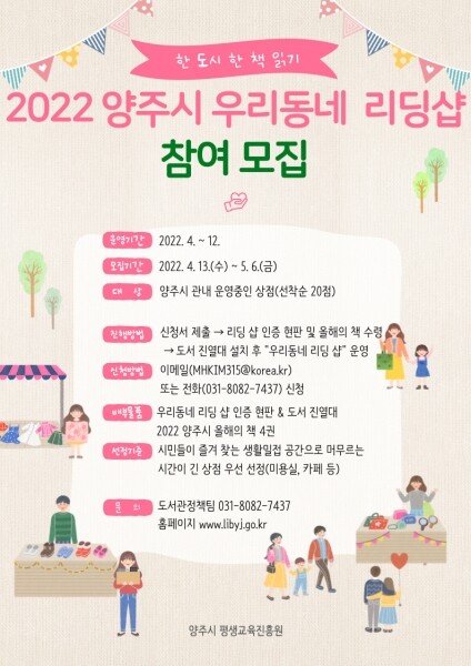 시민들이 일상에서 독서를 즐길 수 있도록 점포 한 켠에 2022 양주 올해의 책을 비치할 수 있는 미용실, 카페 등 생활밀접 공간 운영자라면 누구나 신청할 수 있다.