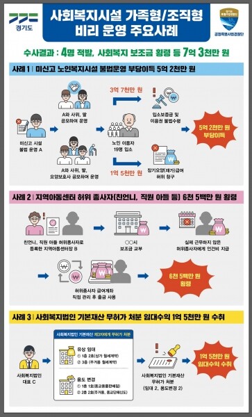 김영수 경기도 공정특별사법경찰단장은 27일 경기도청에서 기자회견을 열고 “지난 1월부터 3월까지 사회복지시설 가족형/조직형 비리 기획 수사 결과 불법행위가 적발된 사회복지시설 등 3곳과 이 시설의 시설장 등 4명을 적발했고 수사가 마무리되는 대로 검찰에 송치할 계획”이라고 말했다.