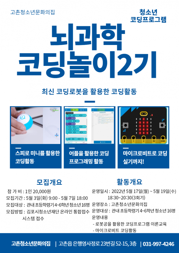 청소년 코딩 프로그램은 초등학령기 청소년 4~6학년 16명 대상, 대면 프로그램으로 5월 23일 ~ 5월 25일 19:00 ~ 21:00 진행한다.