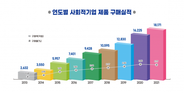 지난해 공공기관의 총구매액 대비 사회적기업 제품 구매율은 2.77%로 전년 대비 다소 감소했으나, 구매액은 12% 이상 크게 증가한 것으로 나타났다.