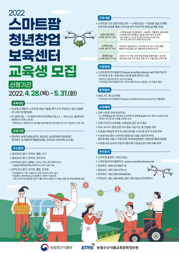 아울러 교육생 모집 설명회를 5월 중에 개최하며 세부 일정은 ‘스마트팜 코리아’를 통해 공지할 예정이다.