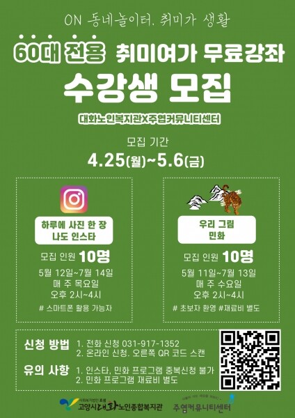 복지관은 주엽커뮤니티센터와 협약을 맺고 취미여가와 동아리 활동 공간을 지원받아 초기 노령층인 60대를 대상으로 ‘매일 한 장 나도 인스타’와 ‘우리 그림 민화’ 프로그램을 운영할 예정이다.