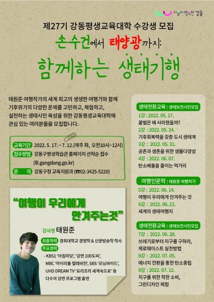 ‘손수건에서 태양광까지: 함께하는 생태기행’을 주제로 5월 17일부터 7월 12일까지 매주 화요일 오전 10시, 강동구 평생학습관 3층 대강의실에서 운영된다.