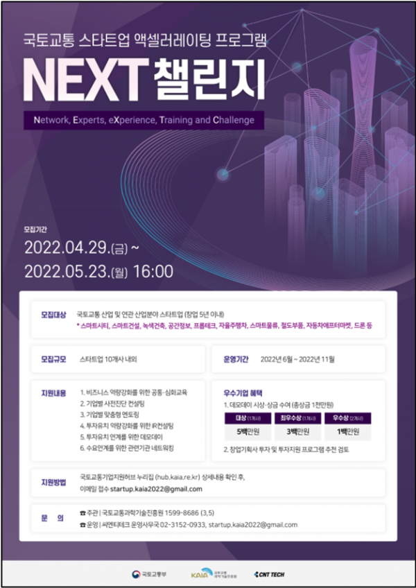 국토교통부와 국토교통과학기술진흥원은 2022년 국토교통 창업기획자를 선정)했고 4월 29일부터 5월 23일까지 참여를 원하는 스타트업의 신청을 받아 서류심사와 발표평가를 거쳐 6월 중 최종 선정하고 11월까지 다양한 기업 전문 컨설팅을 지원할 예정이다.