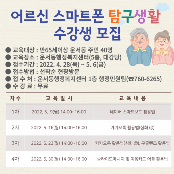 교육대상은 운서동에 거주하는 만 65세 이상 주민 40명이다.