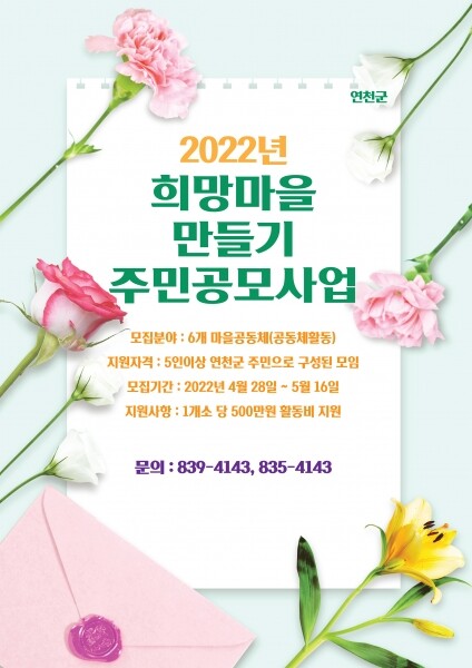 신청은 오는 5월 16일 월요일 오후 6시까지 연천군 마을공동체지원센터에서 접수한다.