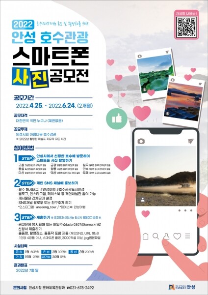 안성시 관계자는 “이번 공모전을 통해 안성을 방문하는 분들이 아름다운 호수의 풍경을 담아가고 감상하며 그동안 코로나19로 지친 모든 이들이 심신을 달래고 힐링할 수 있는 계기가 되길 바란다”고 말했다.