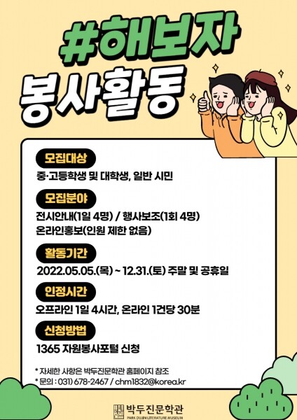 기타 자세한 사항은 박두진문학관 홈페이지 공지사항 또는 1365자원봉사포털 모집공고에서 확인할 수 있다.