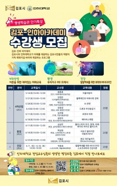 특히 단기특강 강사진으로 원종훈교수 등 인하대학교 전임교수 10명이 각기 다른 주제별로 직접 현장에서 시민들을 만날 예정으로 수준 높은 강의를 무료로 김포에서 경험 할 수 있어 기대를 모으고 있다.