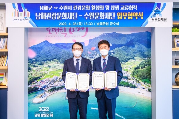 이에 장충남 이사장은 “2022남해군 방문의 해를 맞아 ‘법정문화도시’ 수원시와 상생하게 돼 기쁘다 문턱 없는 예술도시로 발돋움한 수원시와 천혜의 생태 자원과 더불어 역사·인물 자원을 지닌 남해군의 역동적인 시너지가 기대된다”고 답했다.