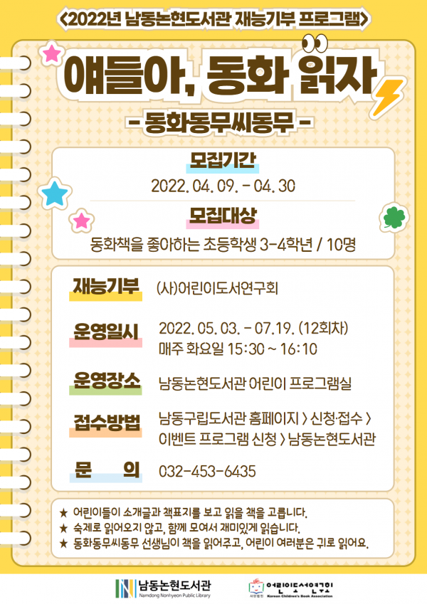 프로그램 접수는 남동구립도서관 홈페이지를 통해 진행 중이며 기타 자세한 사항은 남동논현도서관으로 연락하면 안내받을 수 있다.