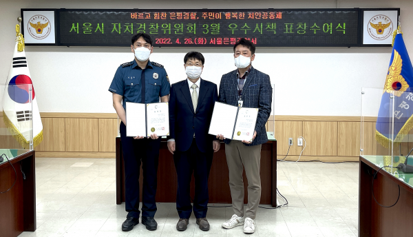 김학배 서울시 자치경찰위원장은 4.26. 은평경찰서를 방문해 유관기관과 합동으로 아동학대에 대한 관심을 제고한 사례와 무인점포 범죄예방?에 기여한 유공자 2명에게 표창을 수여하고 이를 격려했다.