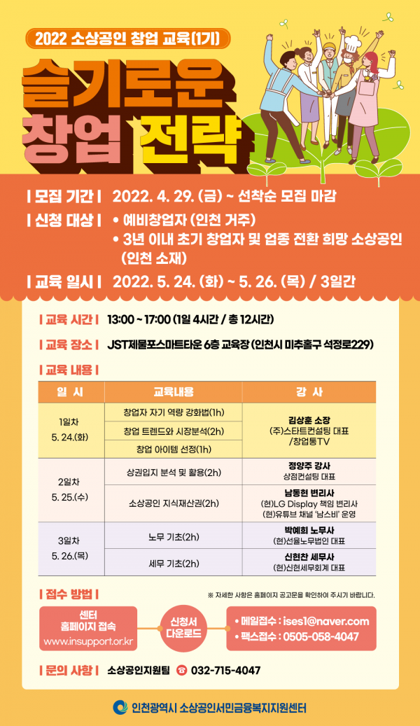 교육 신청·접수는 4월 29일부터 선착순으로 20명을 모집하며 신청을 원하는 소상공인 및 예비창업자는 인천광역시 소상공인서민금융복지지원센터 홈페이지 공지사항 확인 후 접수하면 된다.
