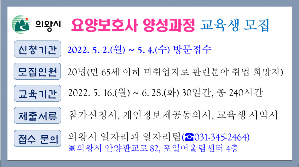 이번 교육은 5월 16일부터 6월 28일까지 30일간 고천동에 위치한 의왕요양보호사교육원에서 진행되며 교육시간은 총 240시간으로 요양보호 이론 및 실기 160시간과 현장실습 및 대체실습 교육 80시간으로 구성됐다.