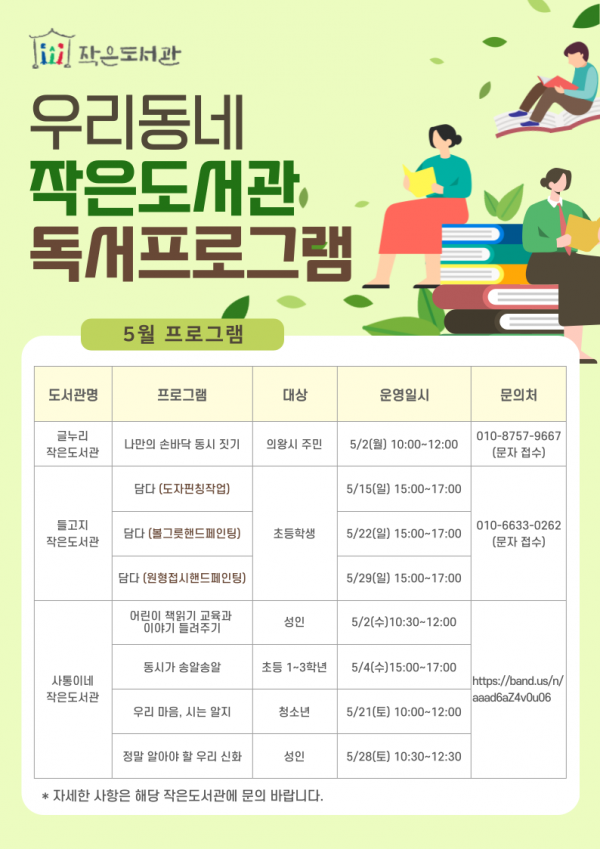 고천동에 위치한 글누리작은도서관에서는 나만의 손바닥 동시 짓기소리를 통한 자작시 짓기를, 이동에 위치한 들고지작은도서관에서는 동시와 도예작업을 통한 담다 끼니이야기 프로그램을 진행할 예정이다.