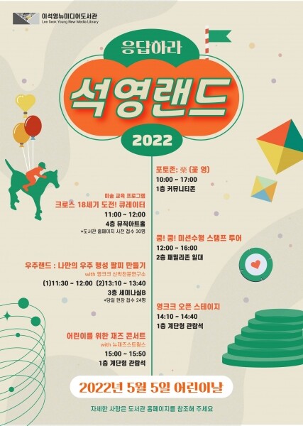 어린이날 행사는 이석영뉴미디어도서관 특화 공간인 4층 뮤직아트홀과 1층 계단형 관람석 등에서 다채롭게 진행되며 특히 이석영뉴미디어도서관 소속 청소년 동아리 영크리에이터크루가 행사의 기획과 운영에 직접 참여해 독특한 아이디어를 선보일 예정이다.