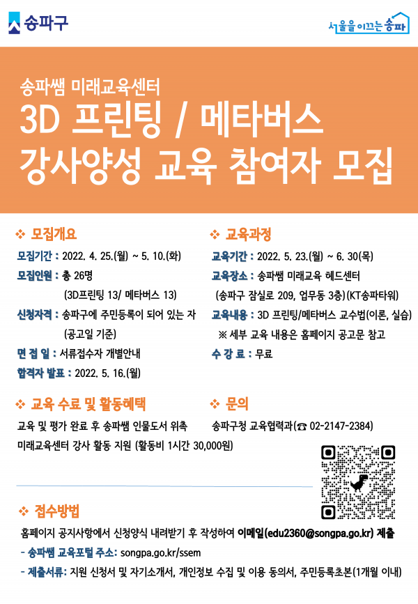 구 관계자는 “지난해 송파쌤 강사양성 과정을 이수한 15명의 구민강사가 미래교육센터와 학교 현장에서 코딩강사로 활발하게 활동하고 있다”며 “교육으로 송파의 미래를 열 의지와 열정 있는 주민들의 많은 관심을 부탁드린다”고 말했다.
