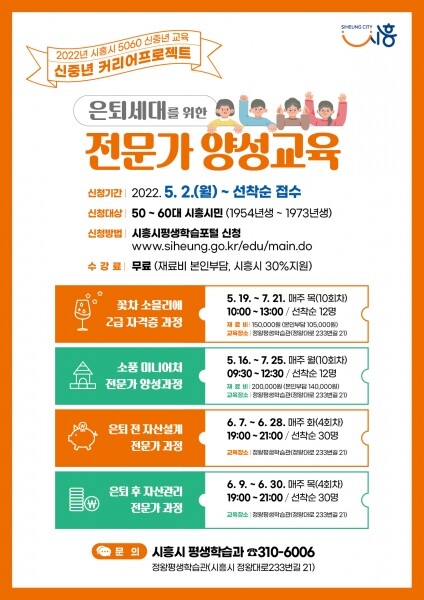 수강 신청은 5월 2일부터 시흥시 평생학습포털을 통해 선착순으로 진행되며 관내 거주하는 50~69세 신중년 세대면 누구나 신청할 수 있다.