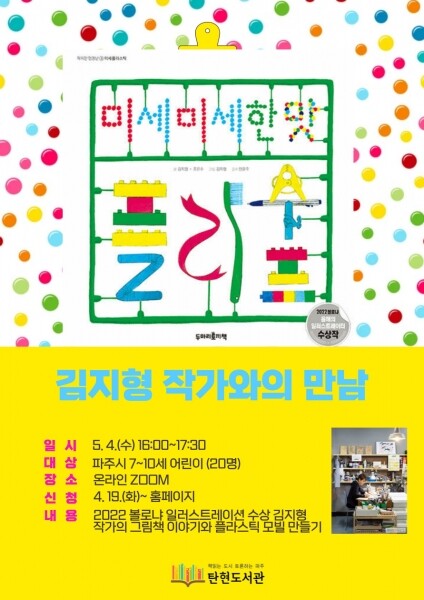 프로그램은 그림책 ‘미세미세한 맛 플라수프’ 저자 김지형 작가가 강사로 나서 1부, 그림책 낭독, 책 만드는 과정과 작가의 작업노트 및 미공개컷 공유 2부, 플라스틱 재활용 쓰레기를 이용해 ‘새활용품’ 만들기로 진행된다.