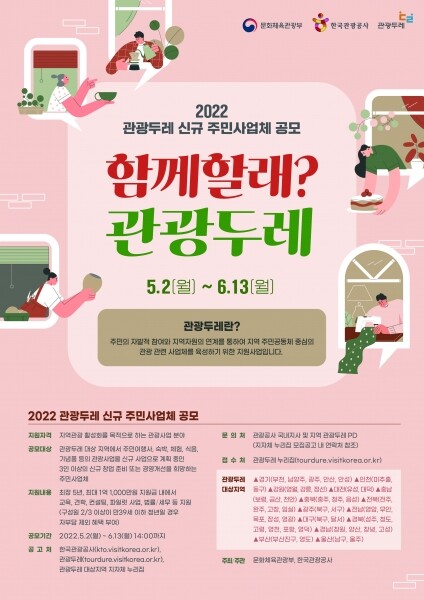 관광두레 사업에 참여하기를 원하는 주민공동체 또는 사업체는 반드시 지역별 담당 관광두레 PD와 협의를 거친 후 6월 13일 오후 2시까지 관광두레 누리집에 신청서를 접수하면 된다.