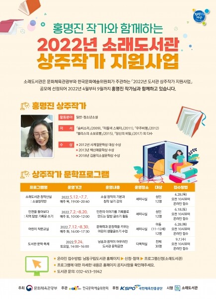 앞서 소래도서관은 문화체육관광부가 주최하고 한국문화예술위원회가 주관하는‘2022년 도서관 상주 작가 지원사업’에 선정돼 지역 문인 채용 공고와 심사를 거쳐 홍명진 작가를 채용했다.