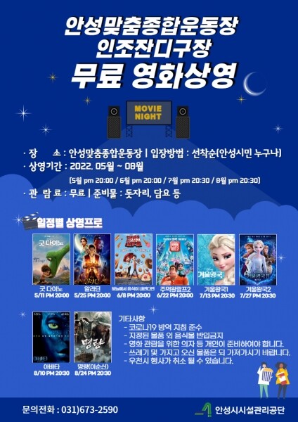 영화는 애니메이션 등 가족용 위주의 영화로 선정해 안성시민 누구나 자유롭게 영화를 관람할 수 있고 영화를 관람하고자 하는 시민은 바닥에 깔고 앉을 돗자리와 담요를 준비하면 된다.