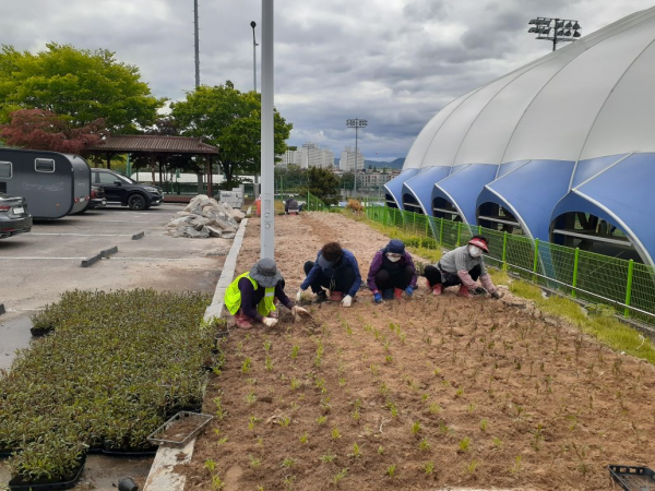 이에 종합운동장 입구 180m에 연산홍 1,400주와 주차장 및 배드민턴장 주변에 바늘꽃 1만본, 그래도 주차장 일대에 꽃잔디 500본을 식재해 환경개선에 나서고 있다.