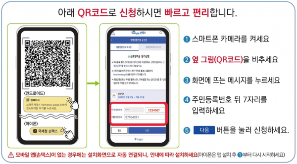 모바일안내문의‘열람하기→본인인증→신청하기’를 누르거나 우편안내문의‘큐알코드’를 비추면 개별인증번호가 채워진 홈택스앱()으로 바로 연결되며 주민등록번호 뒤 7자리를 입력해 신청한다.