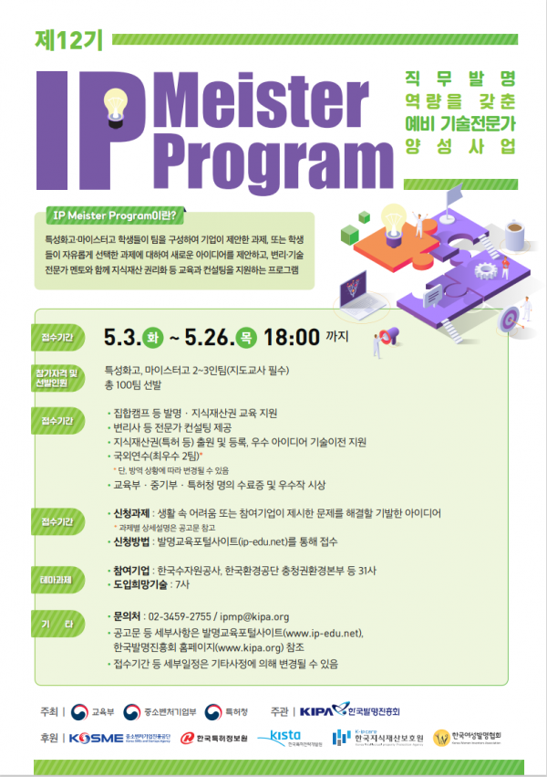 올해로 12번째를 맞이하는 이번 대회는 특성화고·마이스터고 학생들이 자신의 기발한 아이디어를 구체화·고도화해 특허로 보호받고 사업 아이템으로 발전시키는 과정을 직접 체험할 수 있도록 하기 위해 마련됐다.