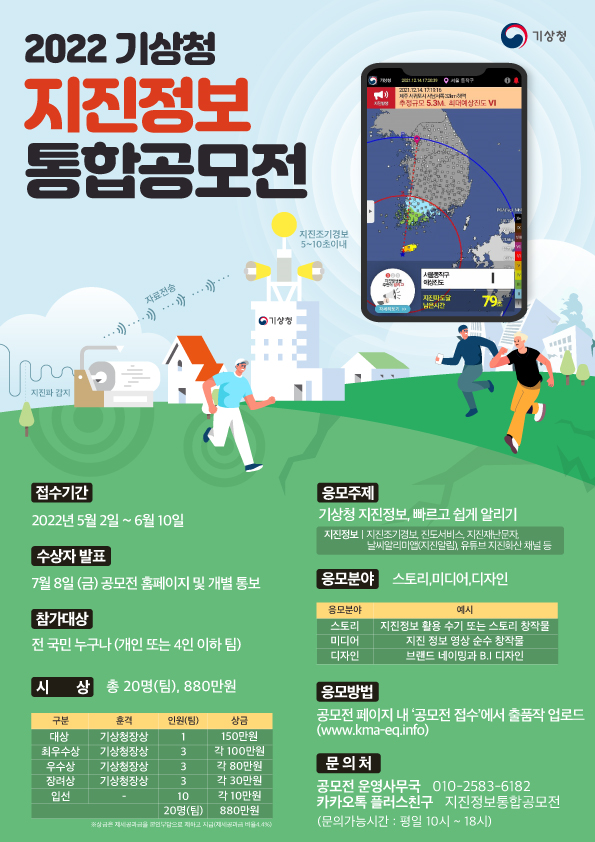 이번 공모전 주제는 ‘지진정보, 빠르고 쉽게 알리기’로 대한민국 국민 누구나 참여할 수 있으며 공모전 누리집을 통해 접수할 수 있다.