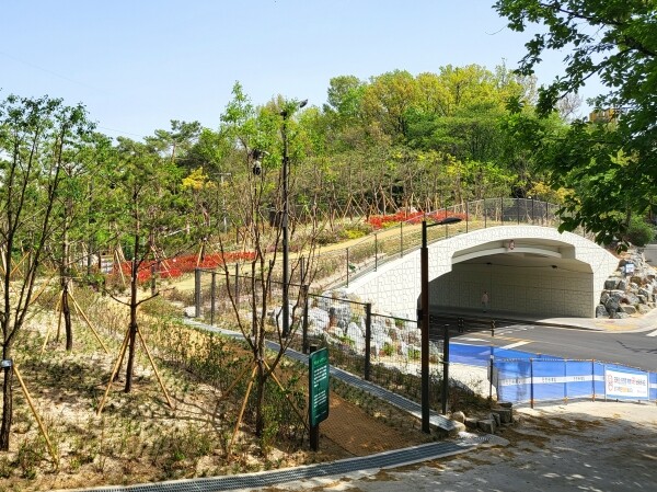 폭 15m, 연장 30m 규모의 해등로 녹지연결로는 교량 상부의 보행로 폭을 줄이고 보행로 위치를 중앙에서 가장자리로 조정해 소형동물의 이동에 적합한 구조로 조성됐다.